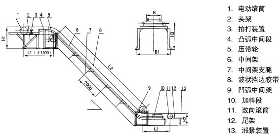 M3/h35° 28 36 50 71 104 120 157 195 216 327 331 466 500 794 45° 19 25 33 57 83 97 127 157 175 271 267 384 414 680 60° 15 19 23 40 58 59 90 112 124 197 190 278 302 524 90 9 11 15 21 31 37 48 60 66 106 102 149 162 281 外型尺寸 頭輪帶面高H1 1200 1350 1615 1815 2000,2200 2300,2525 2525,2700 尾輪帶面高H2 690 800 950 1115 1250,1400 1600,1700 1600,1700 中間段帶面高H3 700 800 850 1115 850,1200 1400,1500 1600,1700 中間段地腳高B1 580 850 1020 1220 1440 1690 1890 注:本表中輸送量按最小橫隔板間距計(jì)算,帶速增減,輸送量成倍增減,其他物料可參見(jiàn)此表確定。